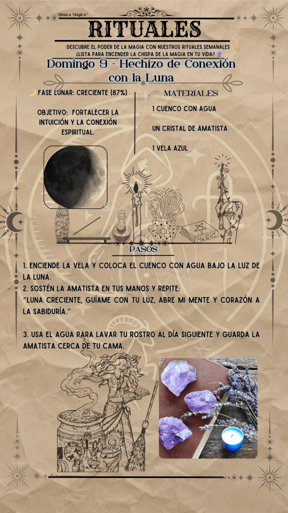 ¿List@ para conectar con el poder de la Luna y transformar tu energía? 🌙✨ Cada semana te traigo rituales y hechizos exclusivos alineados con las fases lunares, diseñados para potenciar tu intención y manifestar lo que deseas. 💫